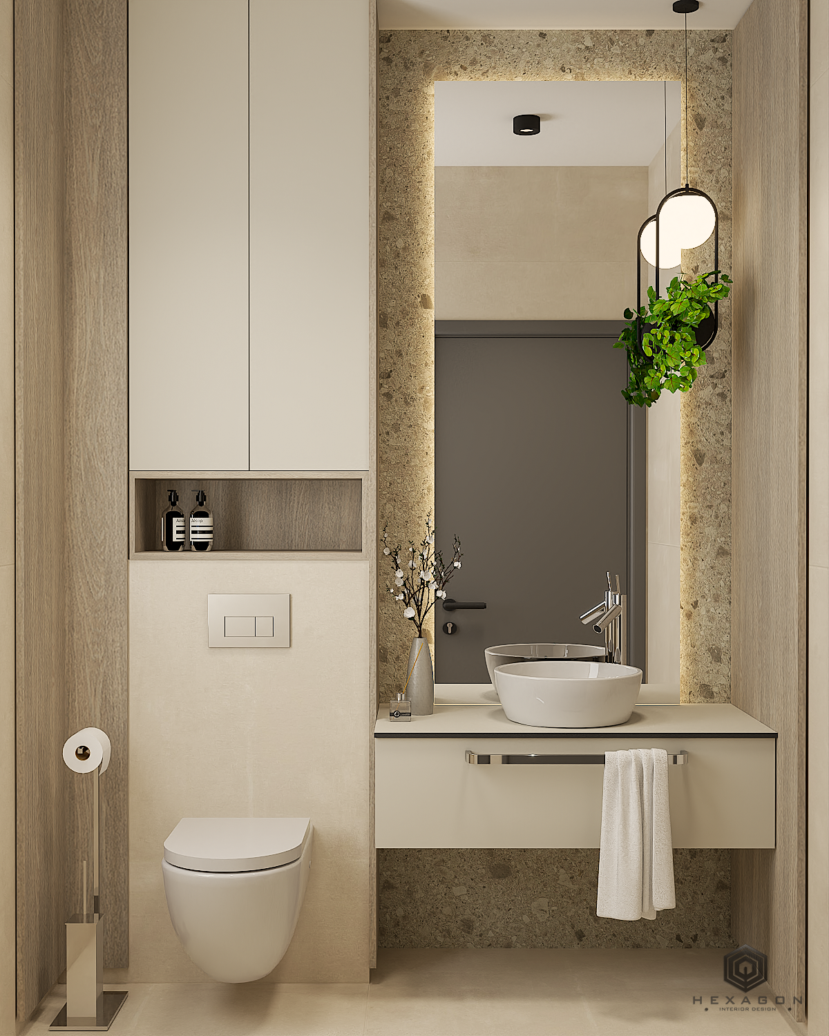 Parterul a fost conceput ca un spațiu dedicat socializării și confortului. Zona de zi, scăldată în lumină naturală și ambientală, este locul perfect pentru momentele petrecute împreună, într-o atmosferă plăcută și relaxantă. Locul de luat masa, integrat armonios în spațiu, asigură o conexiune fluidă între activitățile zilnice și serile petrecute cu cei dragi. Tot la parter, baia destinată oaspeților aduce un plus de funcționalitate, oferind intimitate și confort. Zona scărilor devine un punct de atracție prin integrarea unei sere verticale, un element care aduce prospețimea naturii în interiorul locuinței. Plantele dispuse pe verticală creează o atmosferă vie și relaxantă, completând perfect estetica generală.