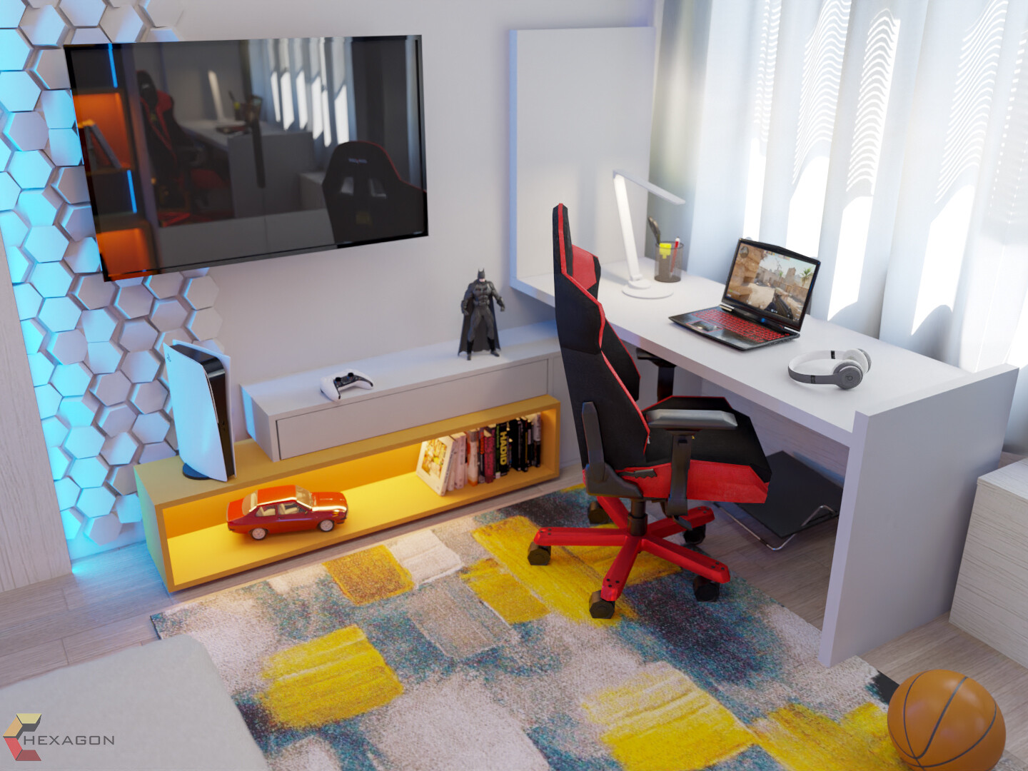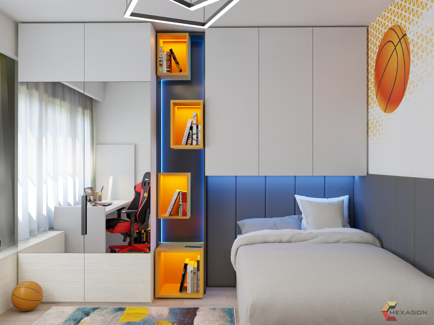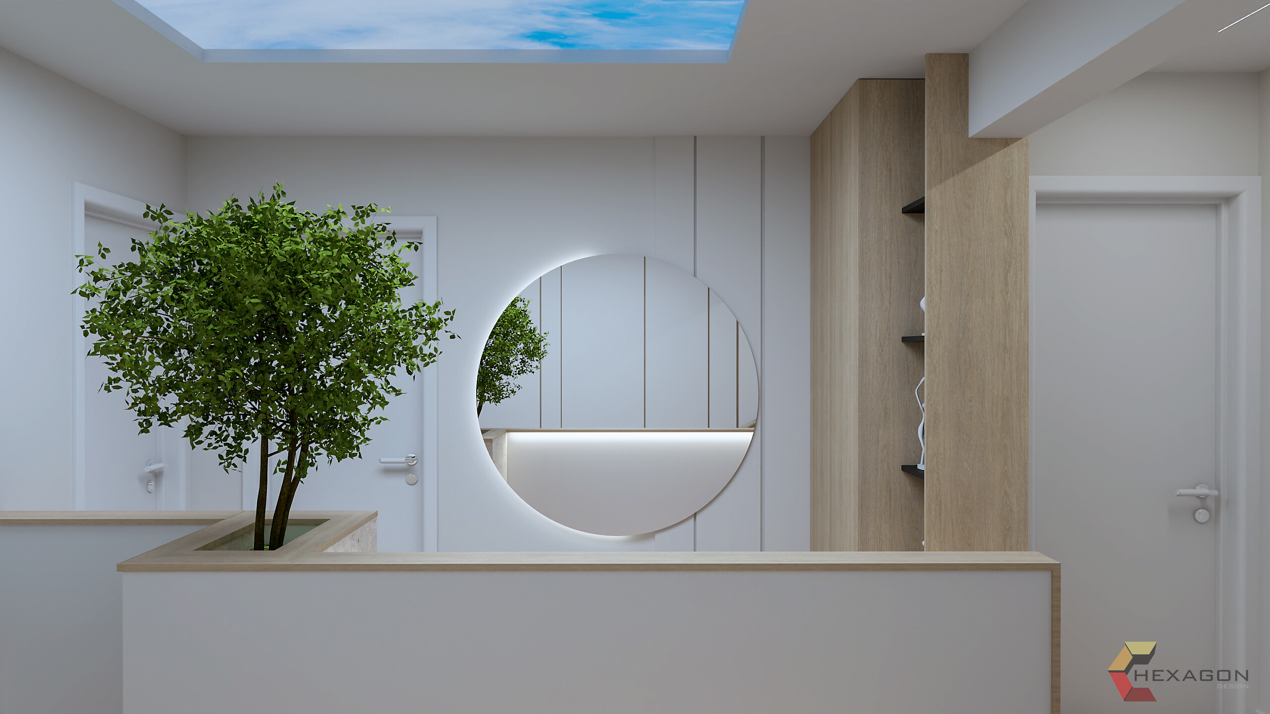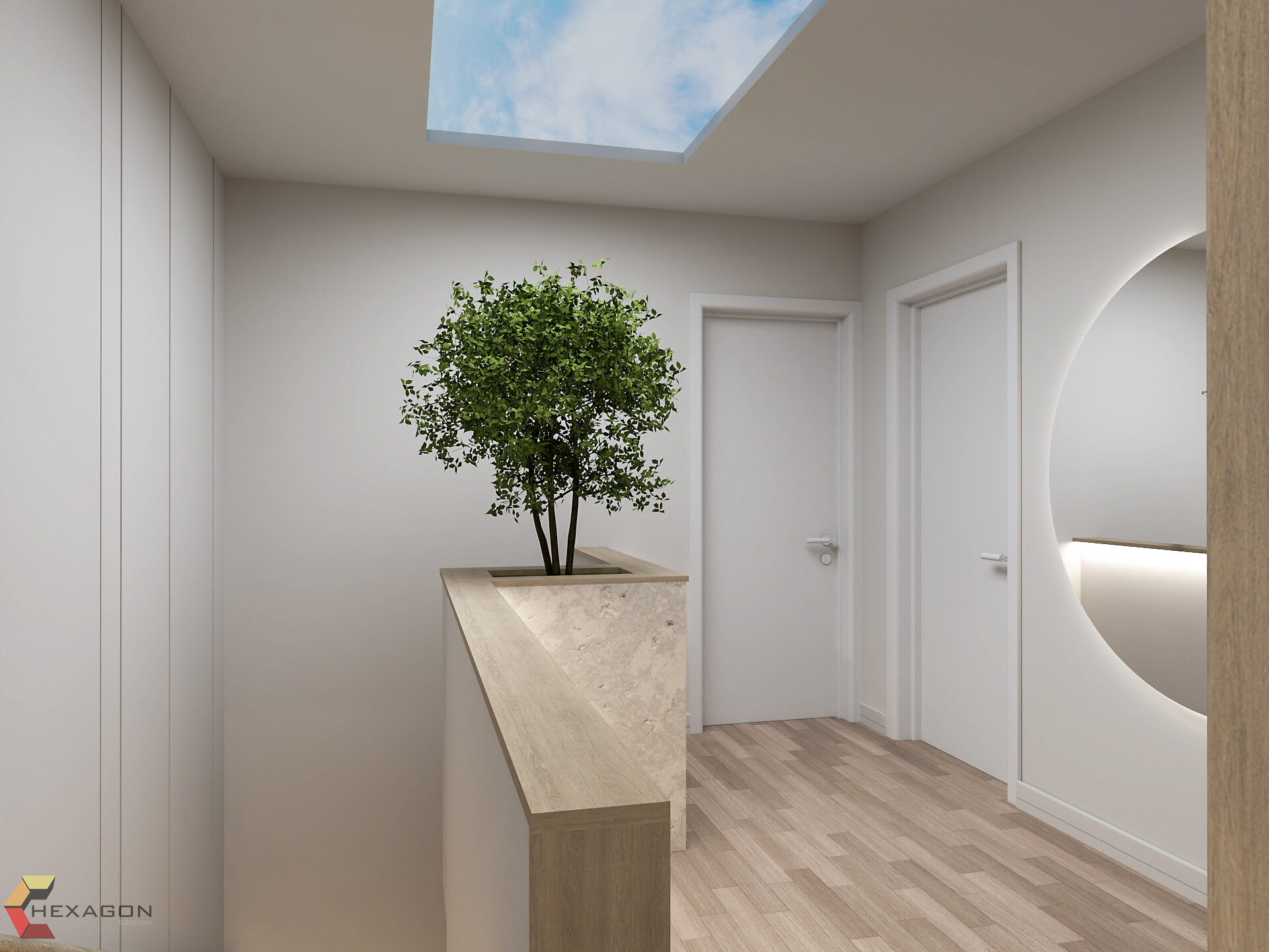 Etajul este dedicat spațiilor private ale familiei, unde fiecare membru are locul său personalizat. Holul central, care face legătura între camere, a fost transformat într-un spațiu luminos și vibrant. Inițial lipsit de lumină naturală, acesta a fost revitalizat prin utilizarea unui plafon din barisol, ce imită perfect lumina naturală, oferind senzația unui iluminator în tavan. Atmosfera este completată de un copac amplasat în mijlocul holului, un element natural care adaugă caracter și viață acestui spațiu.
