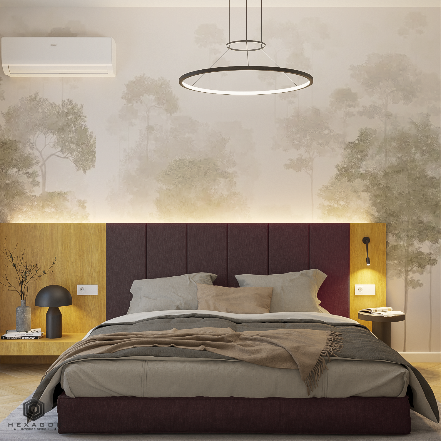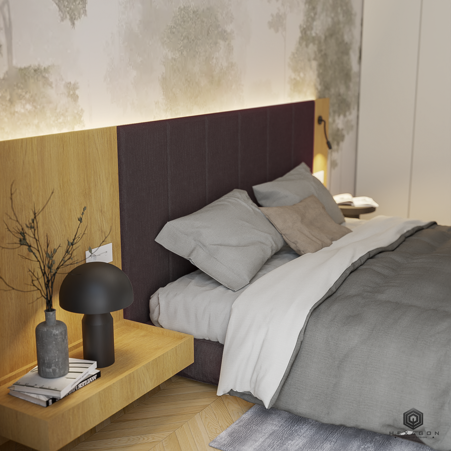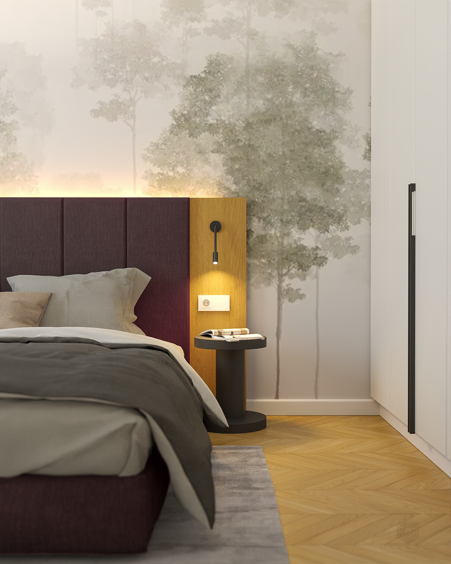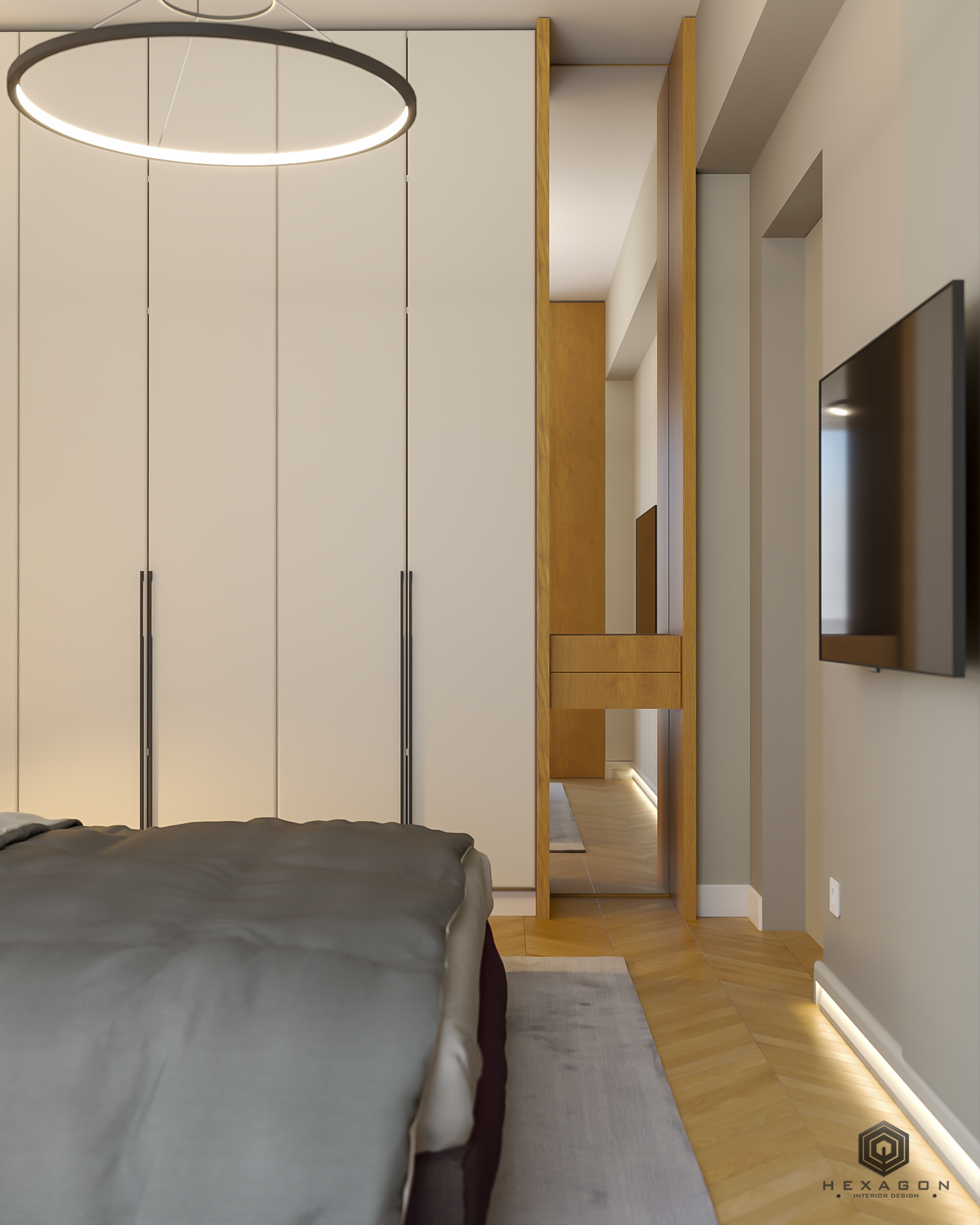 Dormitorul este un spațiu simplu, dar bine structurat, cu un punct focal reprezentat de tapetul din spatele patului, care adaugă personalitate și adâncire întregii încăperi. Pentru a economisi spațiu și a evita aspectul unui dulap clasic, s-a optat pentru integrarea unui dressing elegant, unde oglinzile sunt întrerupte de sertare de depozitare, creând o soluție practică și estetică.