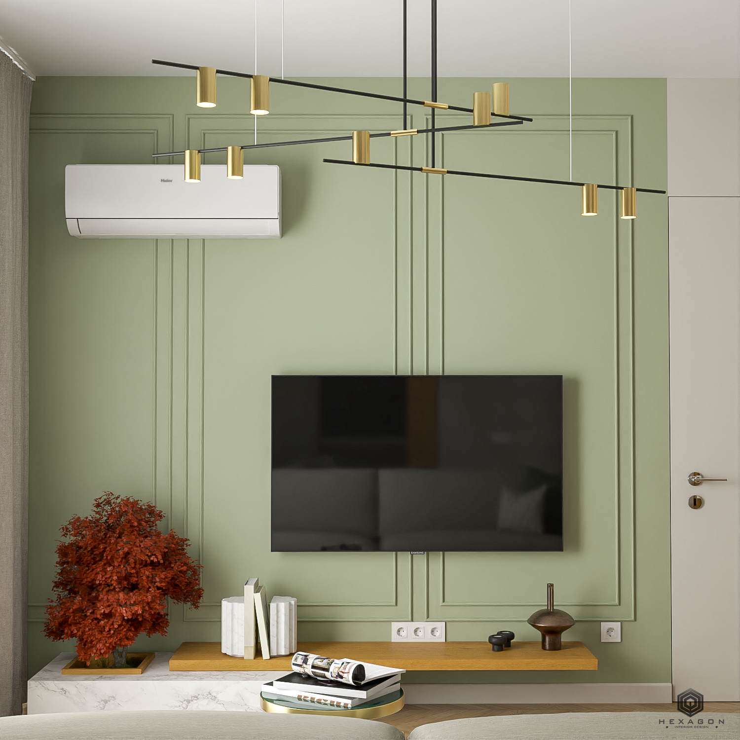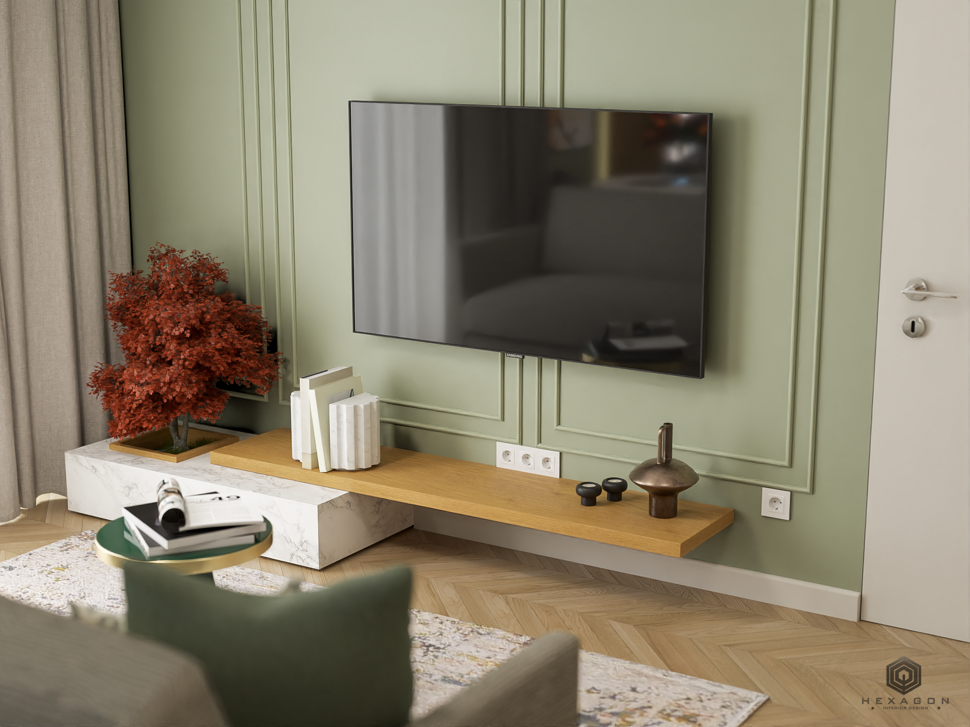 În living, am urmărit integrarea unei mașini de spălat rufe într-un mod discret, dar funcțional, păstrând în același timp un ambient plăcut și organizat. De asemenea, am creat zone dedicate pentru depozitarea lucrurilor administrative, asigurându-ne că apartamentul este eficient organizat și potrivit pentru diverse nevoi ale oaspeților.