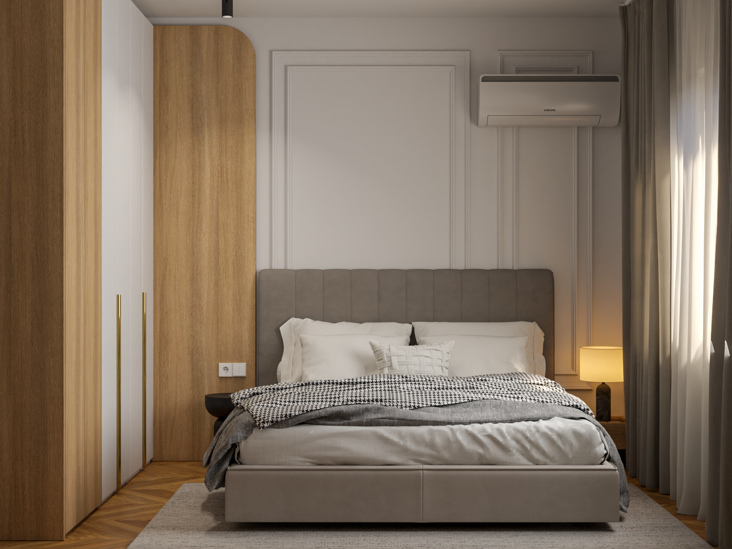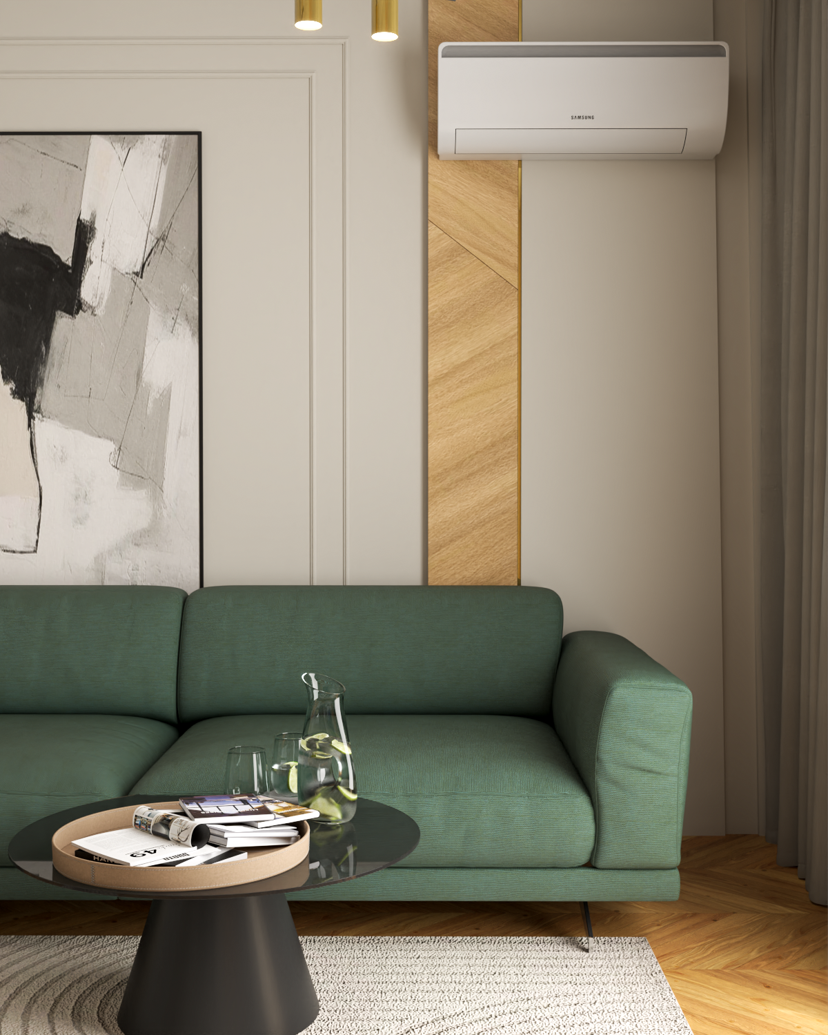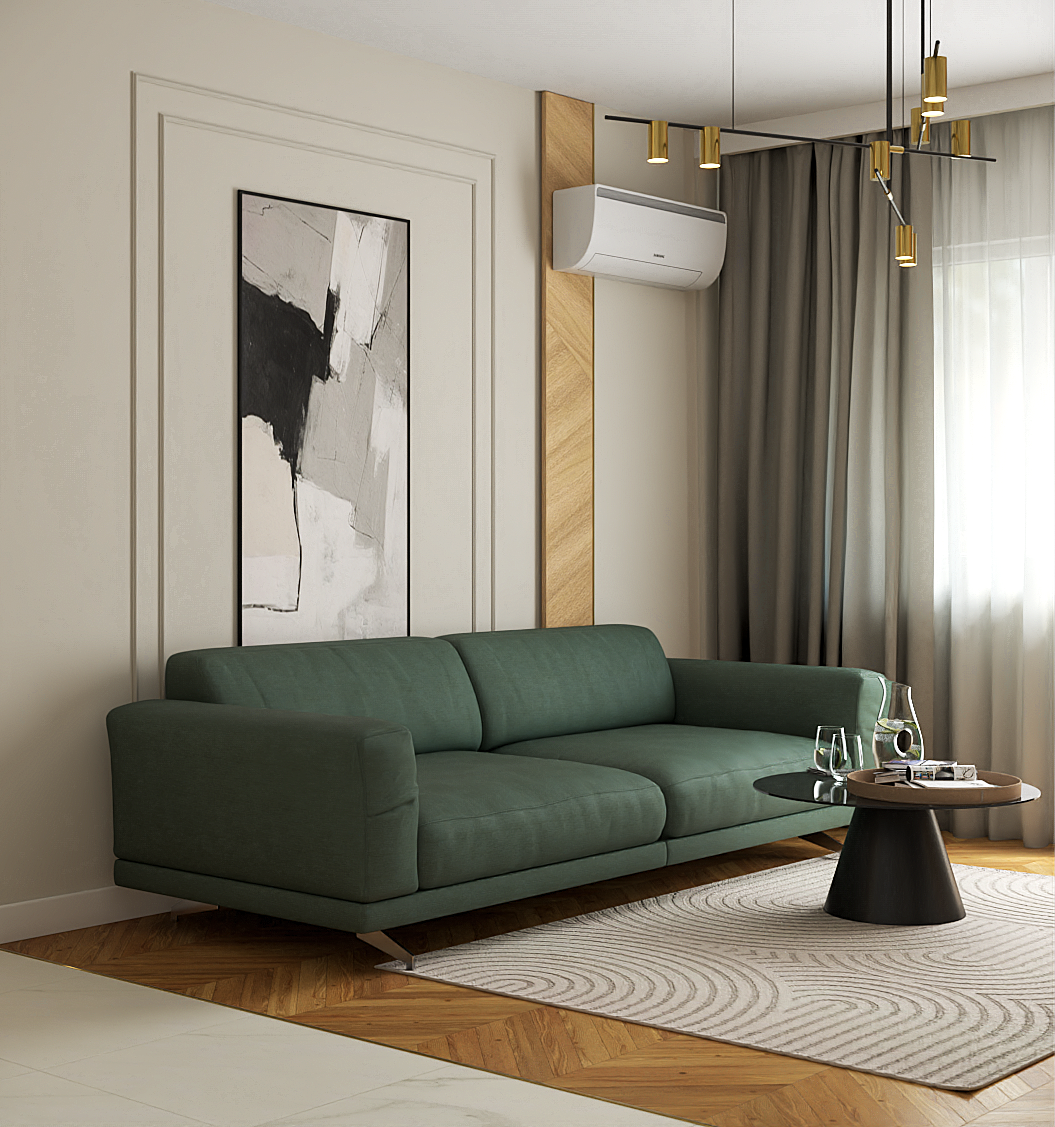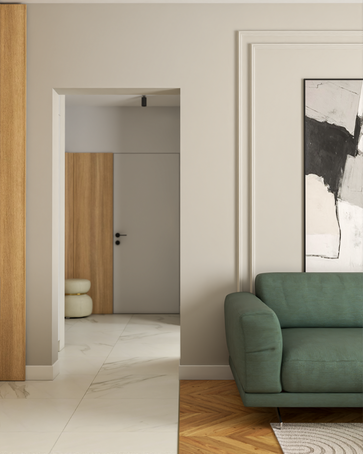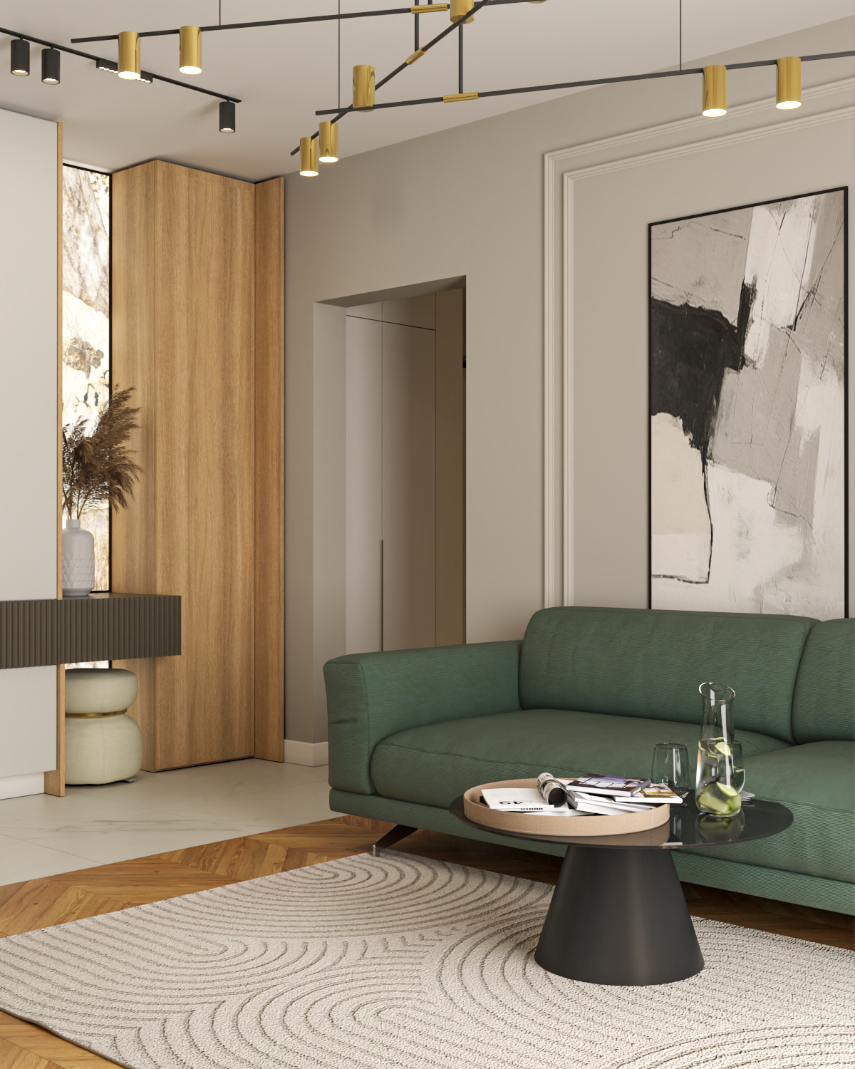 Zona de intrare a fost optimizată prin amplasarea unui dulap central, care delimitează vizual holul de bucătărie și oferă un spațiu generos pentru depozitarea hainelor și încălțămintei. În living, delimitarea vizuală a fost accentuată prin tranziția materialelor de pe podea, unde parchetul se îmbină elegant cu gresia din holul de la intrare. O soluție discretă și bine integrată a fost folosită pentru mascarea furtunurilor aparatului de aer condiționat, menținând un design curat și ordonat.