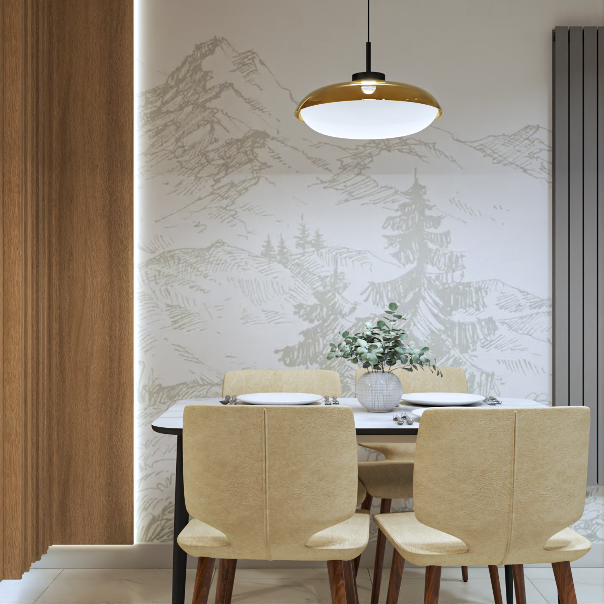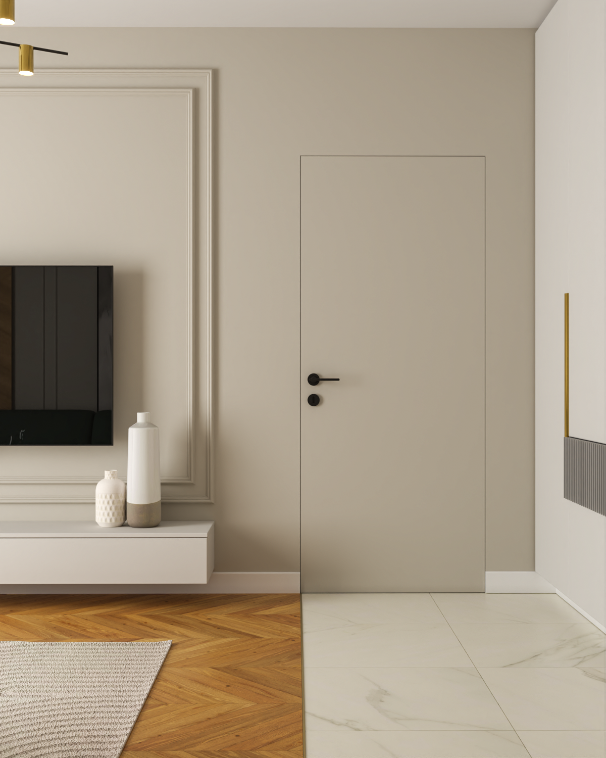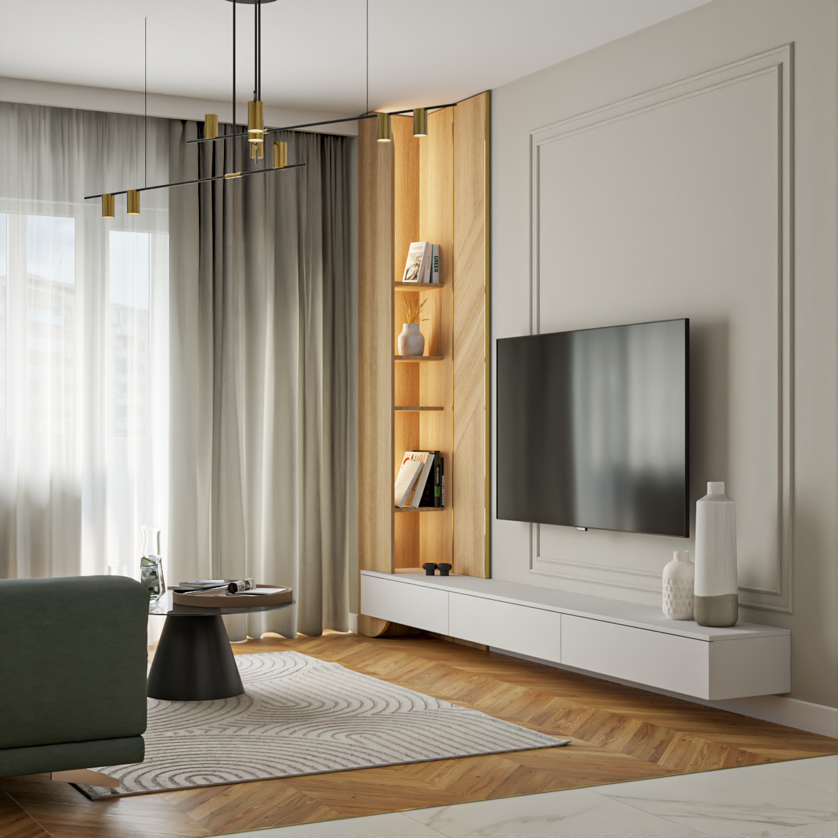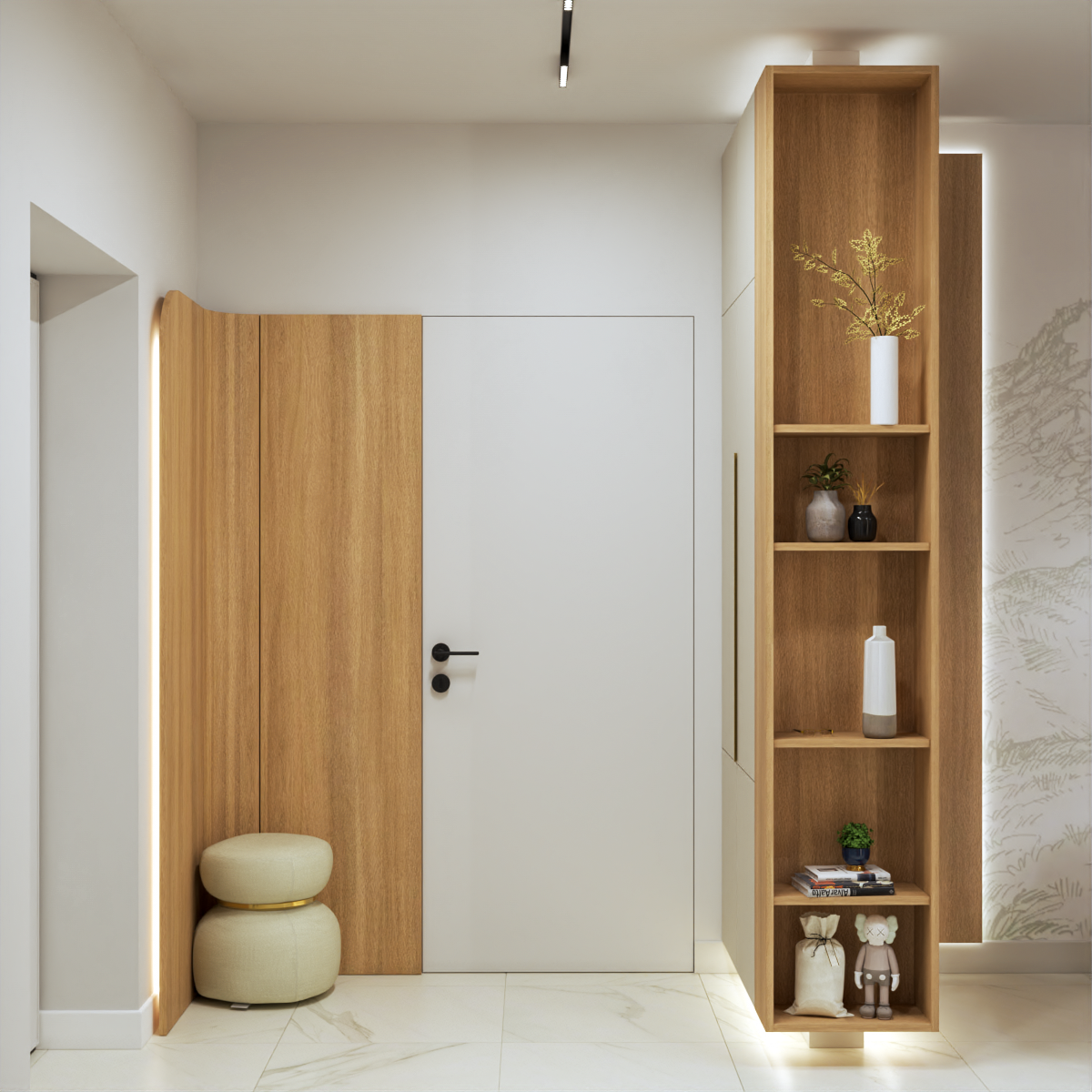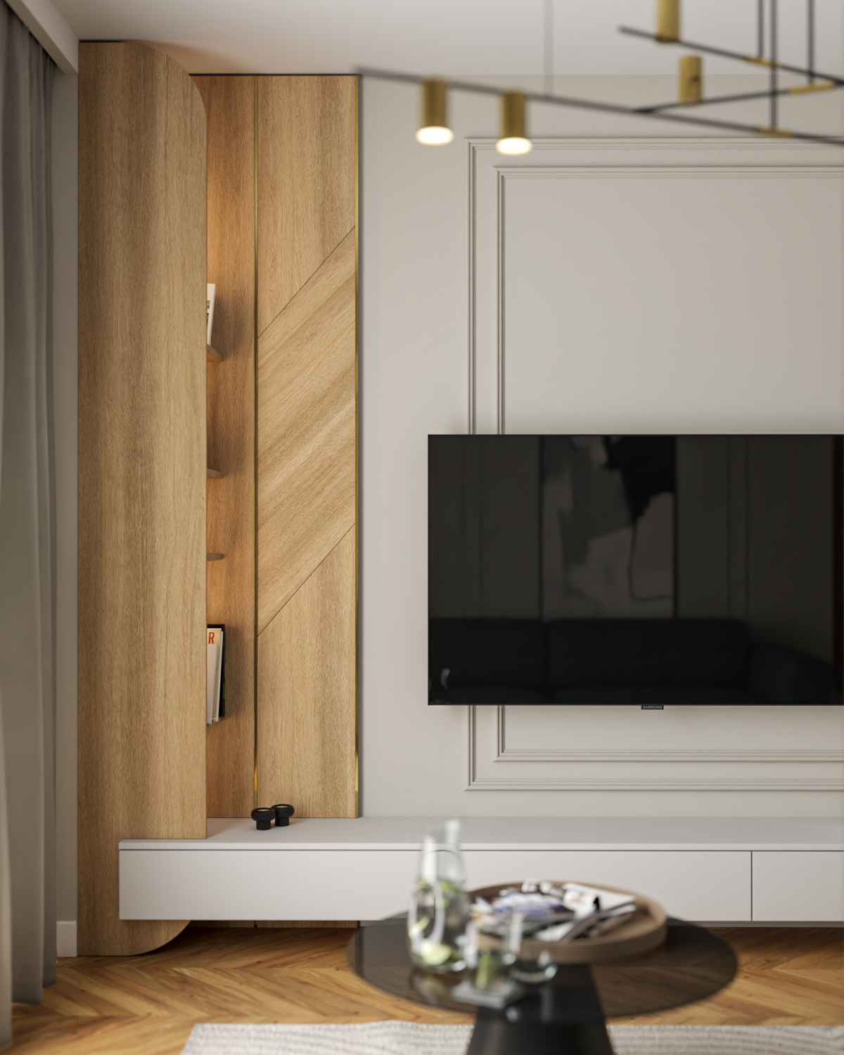 Zona de intrare a fost optimizată prin amplasarea unui dulap central, care delimitează vizual holul de bucătărie și oferă un spațiu generos pentru depozitarea hainelor și încălțămintei. În living, delimitarea vizuală a fost accentuată prin tranziția materialelor de pe podea, unde parchetul se îmbină elegant cu gresia din holul de la intrare. O soluție discretă și bine integrată a fost folosită pentru mascarea furtunurilor aparatului de aer condiționat, menținând un design curat și ordonat.
