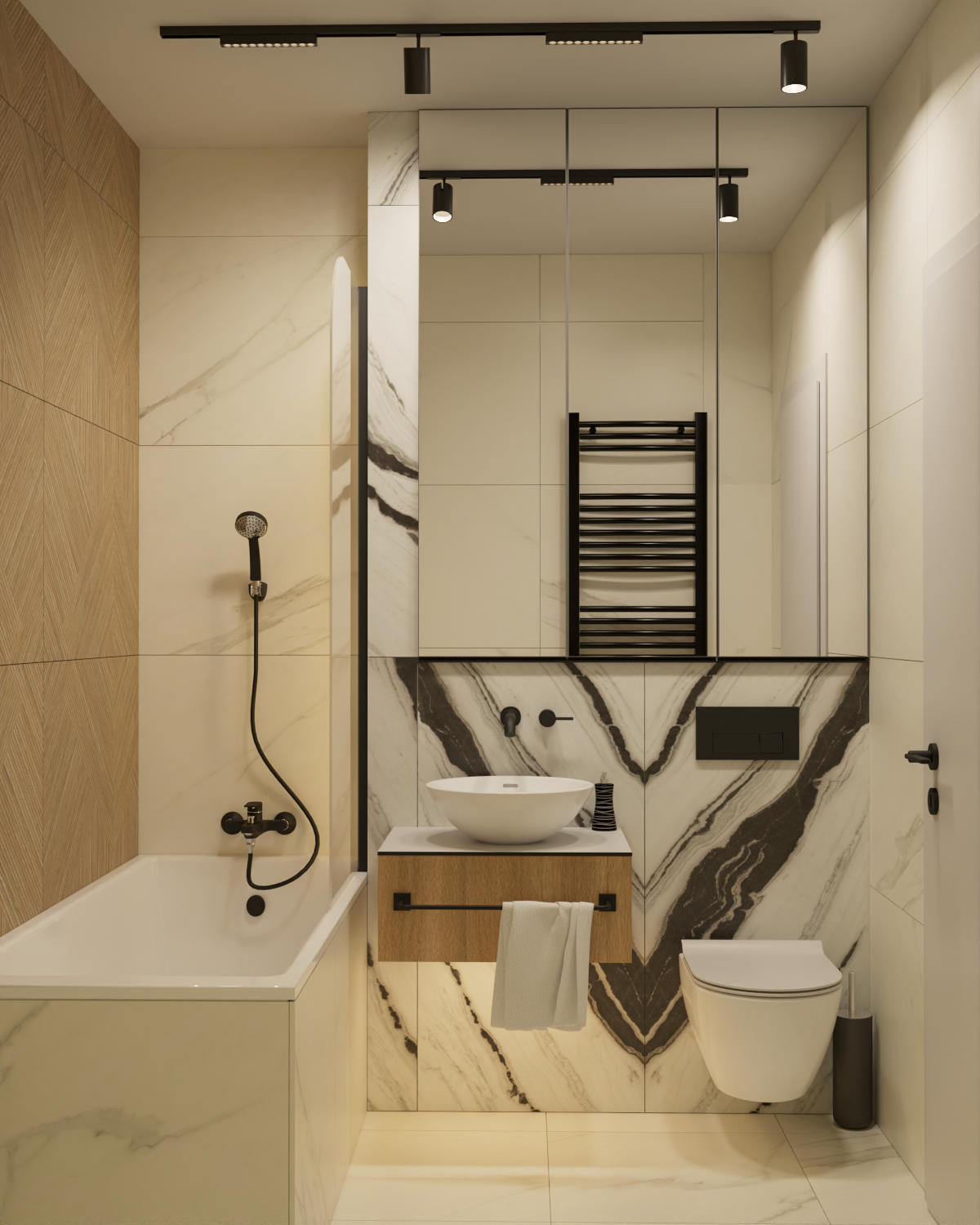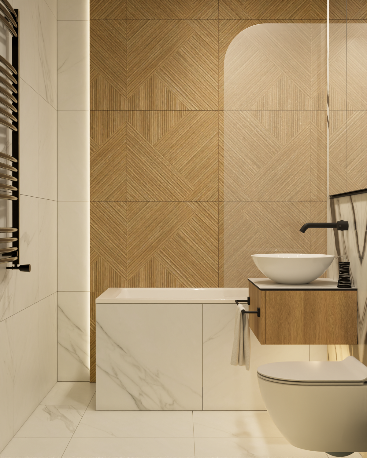 Inițial, apartamentul avea o baie de serviciu lângă dormitorul matrimonial, care a fost transformată într-o baie matrimonială, aducând mai mult confort și intimitate. Bucătăria a fost reconfigurată într-o dispunere în formă de „L”, ceea ce a permis integrarea unei zone de luat masa și crearea unui flux armonios între gătit și socializare.