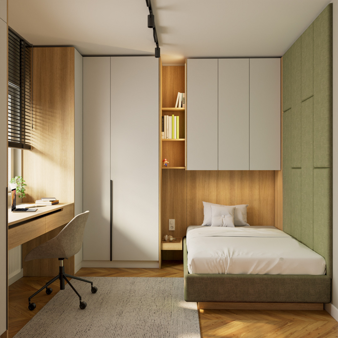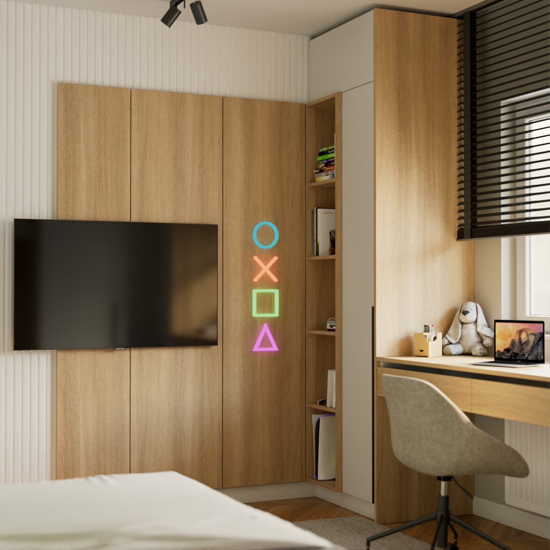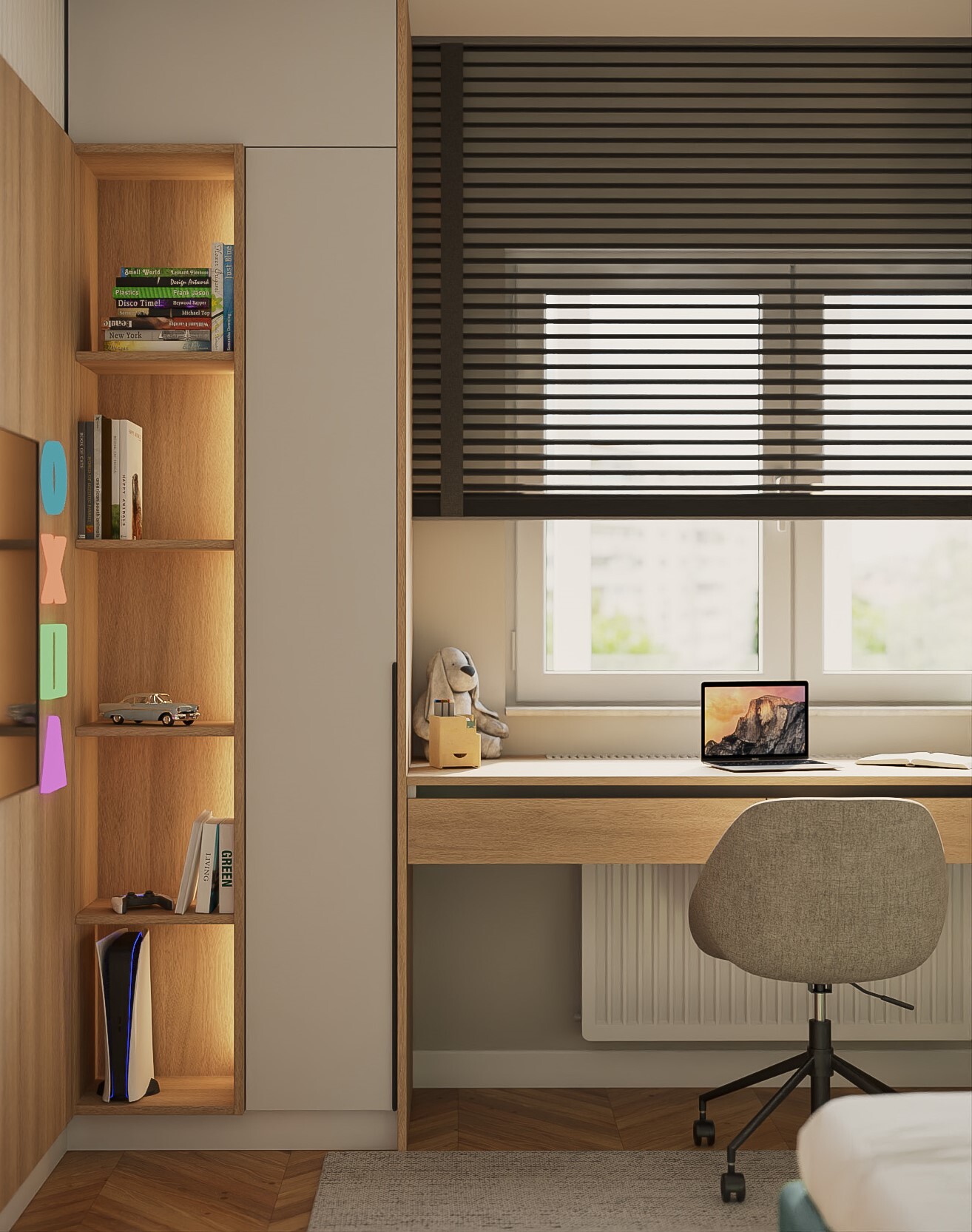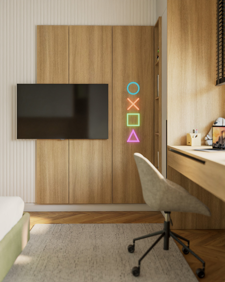 În dormitorul copilului, amenajarea a fost concepută astfel încât să îmbine funcționalitatea și pasiunile acestuia, incluzând o zonă de gaming, un birou pentru studiu și multiple spații de depozitare pentru rechizite și haine.