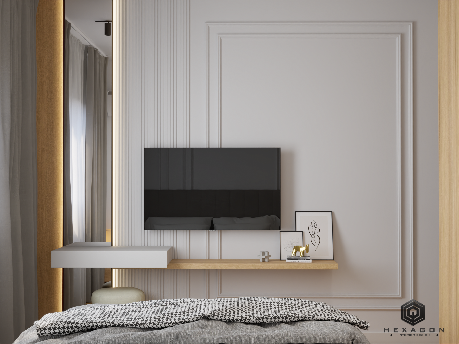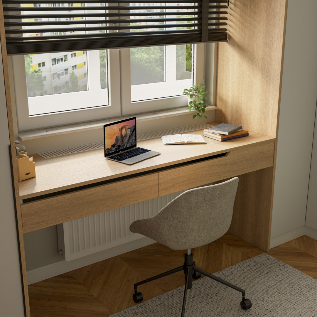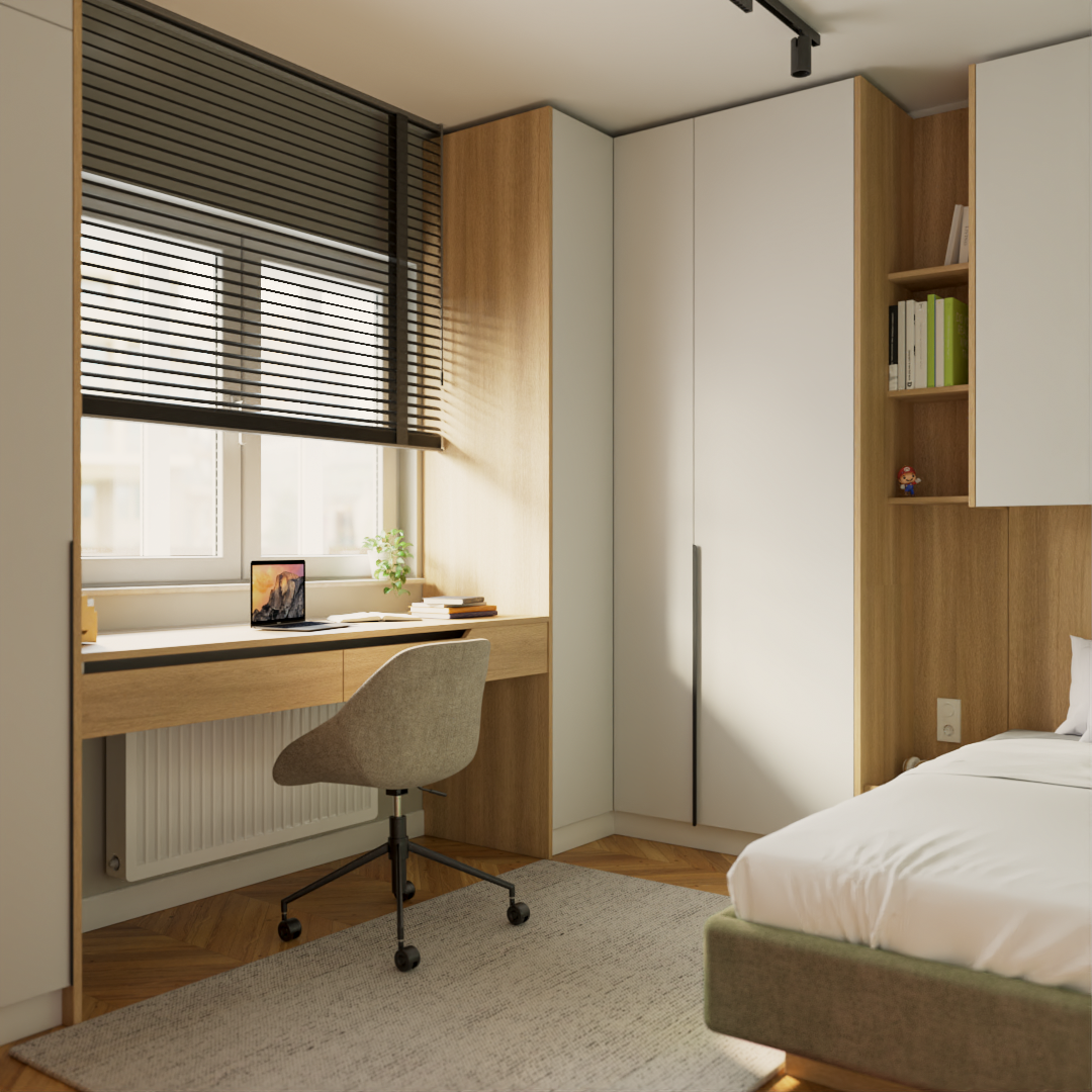În dormitorul copilului, amenajarea a fost concepută astfel încât să îmbine funcționalitatea și pasiunile acestuia, incluzând o zonă de gaming, un birou pentru studiu și multiple spații de depozitare pentru rechizite și haine.