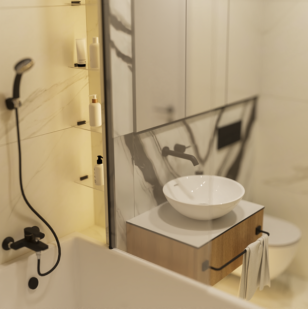 Baia principală a fost amenajată pentru a crea o atmosferă naturală și caldă, utilizând materiale și culori care induc o stare de relaxare. Un detaliu important este zona de depozitare ascunsă pentru produsele cosmetice, care păstrează spațiul aerisit și organizat.
